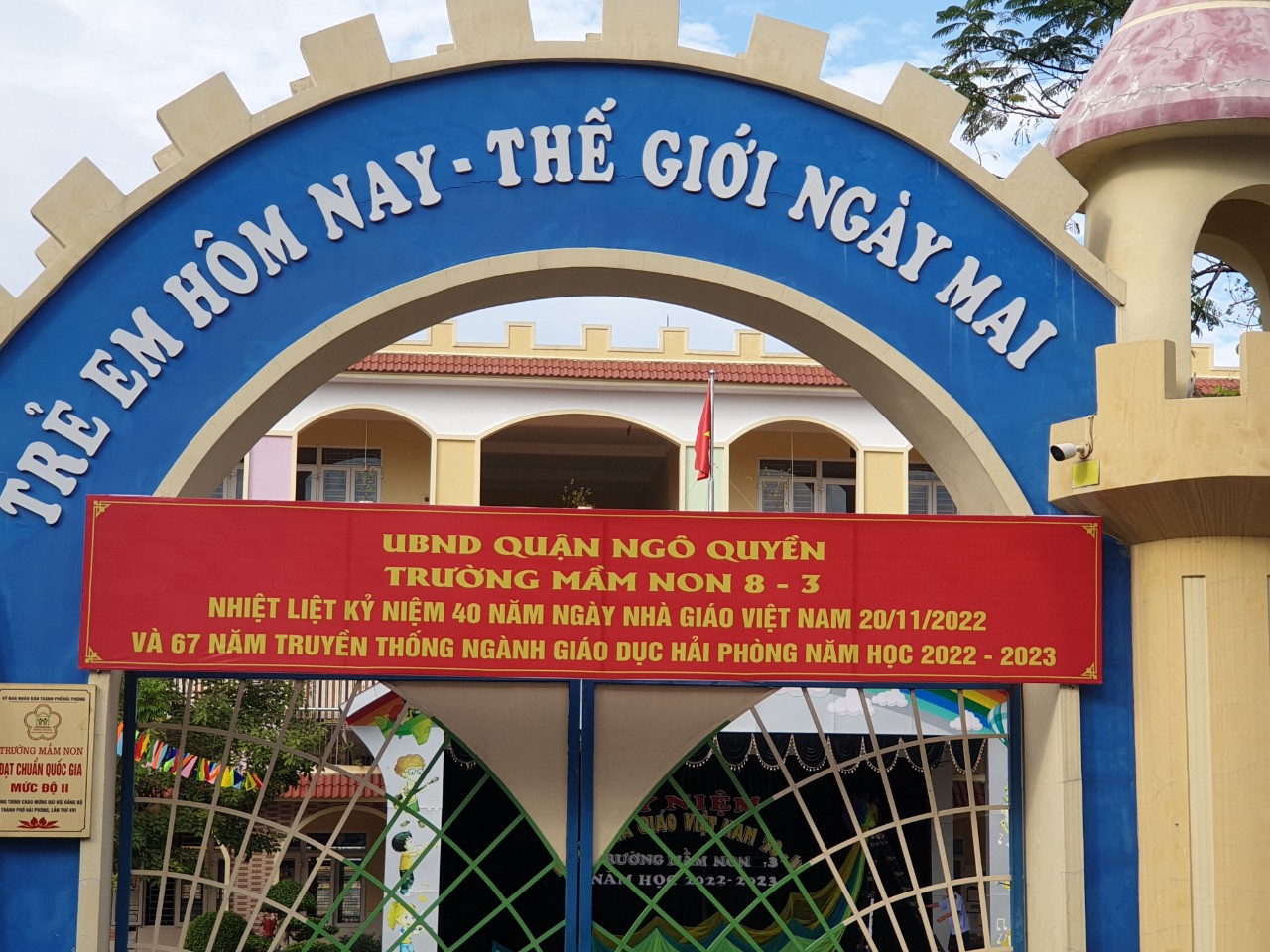 Trường 8-3 của bé đã tưng bừng cờ hoa đón ngày 20/11/2022 ngay từ cổng trường