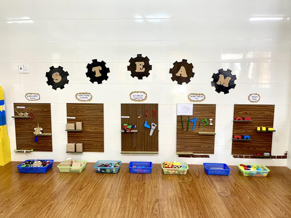 Năm học 2022 – 2023 là năm học thứ 2 nhà trường áp dụng phương pháp giáo dục Steam trong tổ chức các hoạt động học và hoạt động vui chơi cho trẻ. Bằng việc thiết kế môi trường giáo dục và tổ chức các hoạt động học, chơi hấp dẫn các cô giáo đã hình thành và phát triển cho trẻ một số kỹ năng về các lĩnh vực như: Khoa học (Science), Công nghệ (Technology), Kỹ thuật (Engineering), Toán (Math), Nghệ thuật (Art). Thông qua các hoạt động thực hành, trải nghiệm, các dự án giúp trẻ có tính tập trung cao, kiên trì, cẩn thận. Trẻ biết quan tâm đến môi trường xung quanh, phát huy tính cộng đồng, rèn luyện tư duy, thể chất và các mối quan hệ xã hội đồng thời tạo cho các bé một cảm giác thoải mái, vui vẻ, hạnh phúc mỗi khi đến lớp.