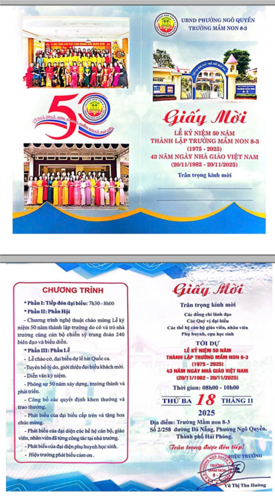 THƯ MỜI THAM DỰ LỄ KỶ NIỆM 50 NĂM THÀNH LẬP "TRƯỜNG MẦM NON 8-3" THÀNH PHỐ HẢI PHÒNG