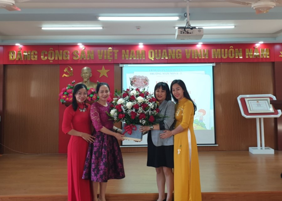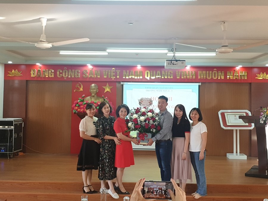Đ/c Vũ Thị Thu Hường và đại diện giáo viên các tổ lên nhận hoa động viên Chúc mừng Hội thi từ Ban đại diện Hội cha mẹ học sinh nhà trường